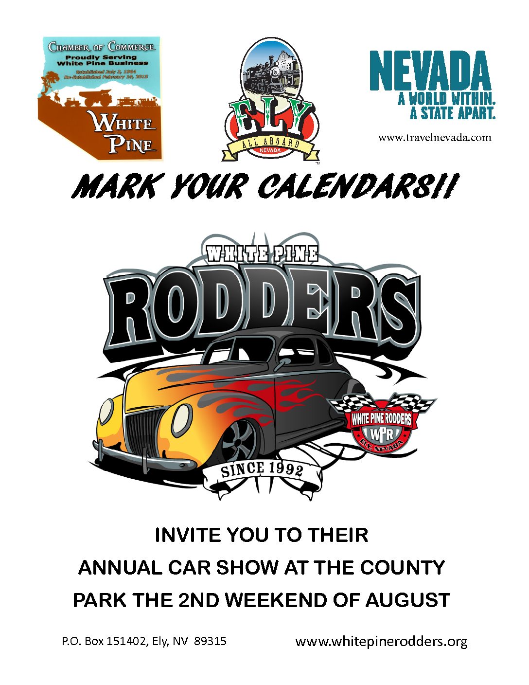 Annual White Pine Rodders' Car Show. Completely open and FREE. Come on down and support a great, long-standing Ely event. There's sure to be plenty of fun for all. After all, there will beautiful cars, trucks and great people? What more could you want?